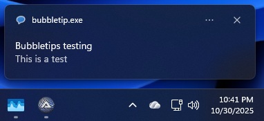 bubbletip.exe t="Bubbletips testing" m="This is a test" s=10