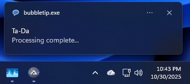 bubbletip.exe t=Ta-Da m="Processing complete..." i=1 s=20