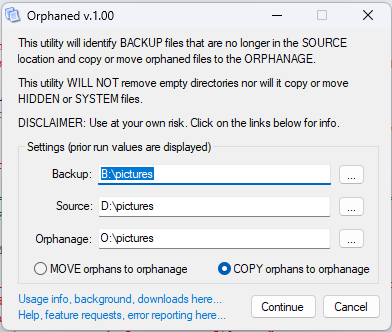 Running Orphaned directly without command line parameters will presented the user with a SETTINGS dialog into which they can select the BACKUP, SOURCE, and ORPHANAGE location and elect to MOVE or COPY orphans: